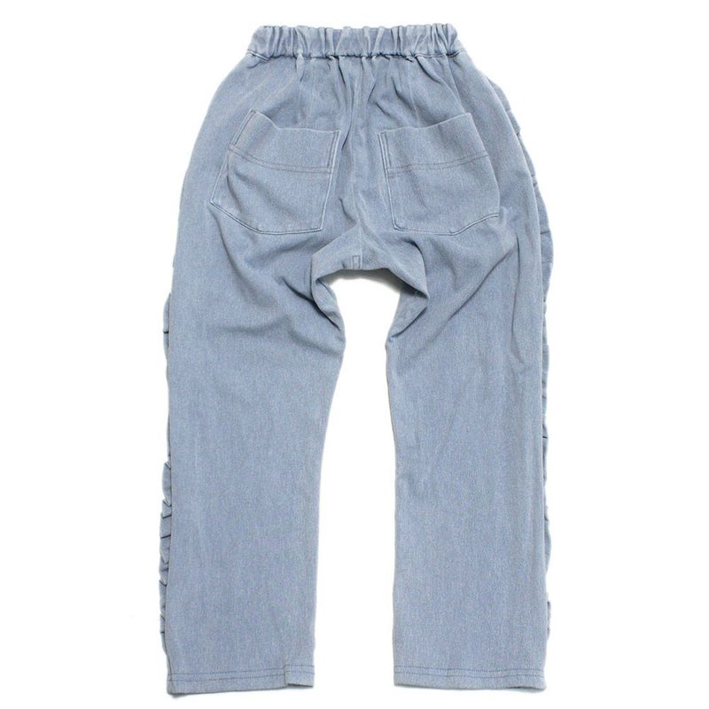 “マルーク”のブルーデニムニットフリルロングパンツ