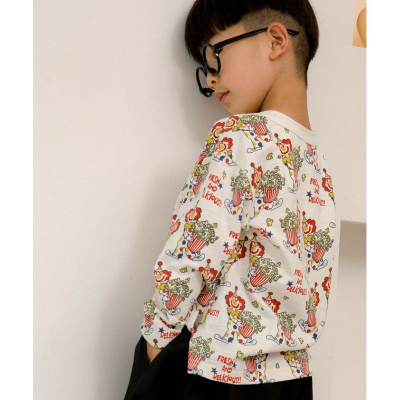 ・ピエロとポップコーンをプリントした総柄のロンT