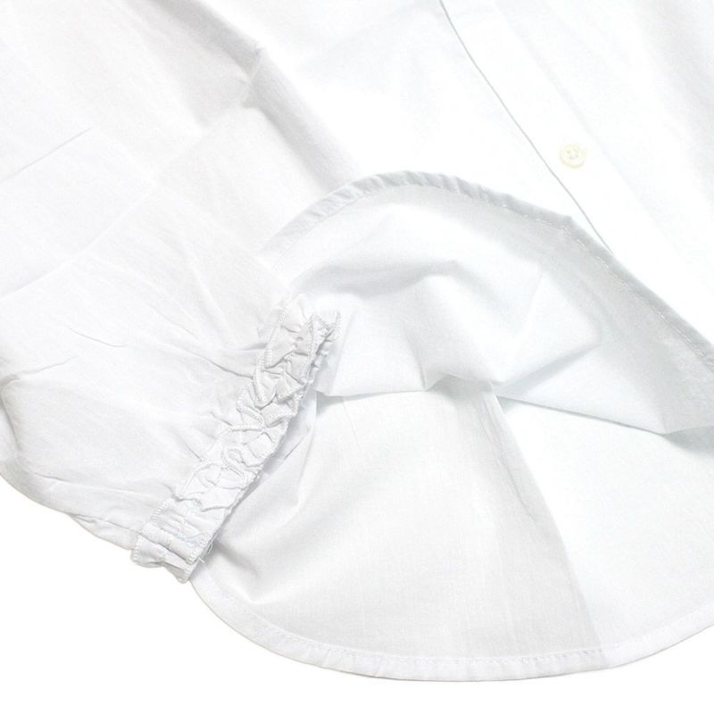 ・襟元と袖口にフリルをあしらったスタンドカラーシャツ