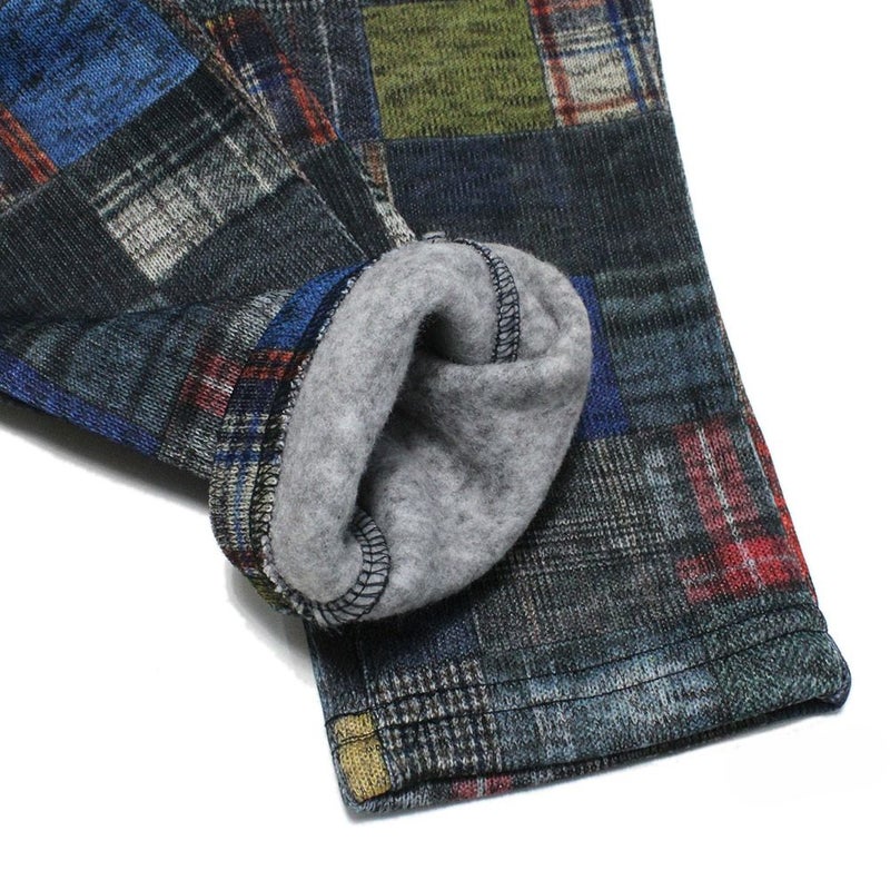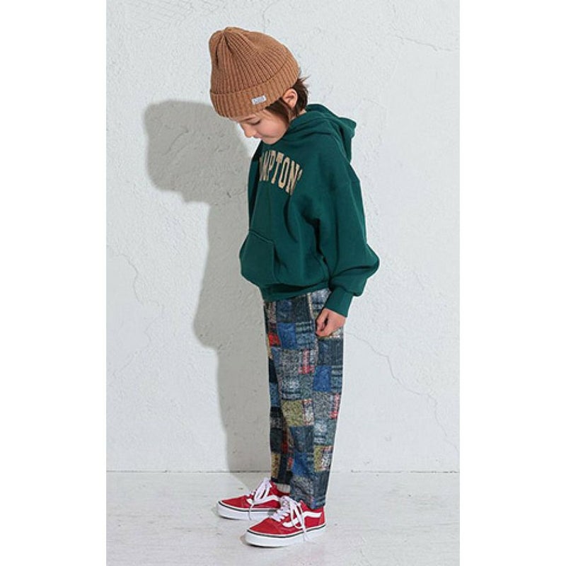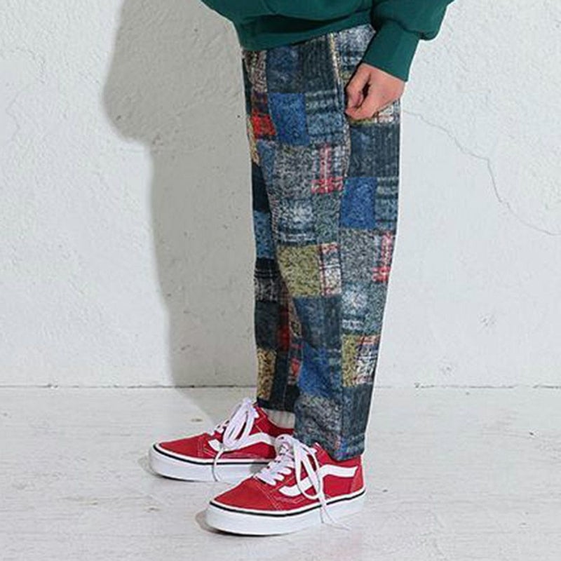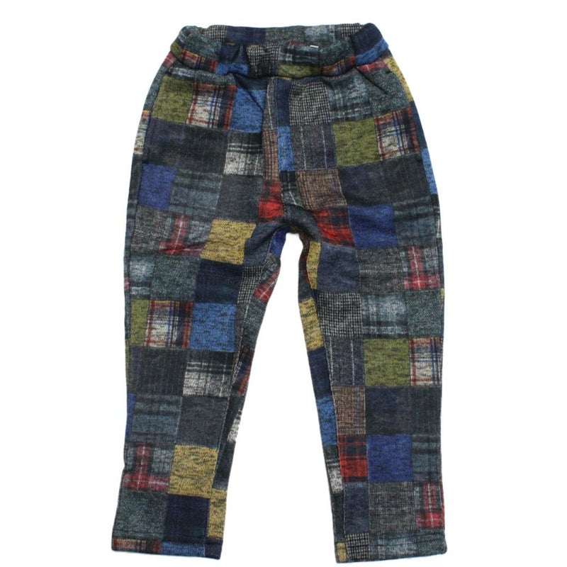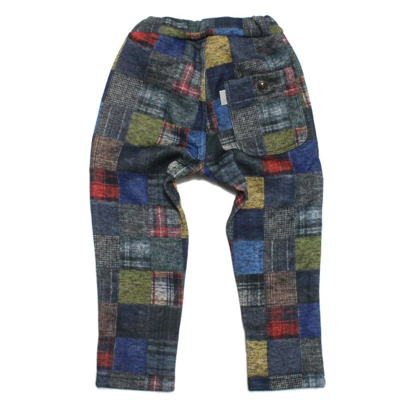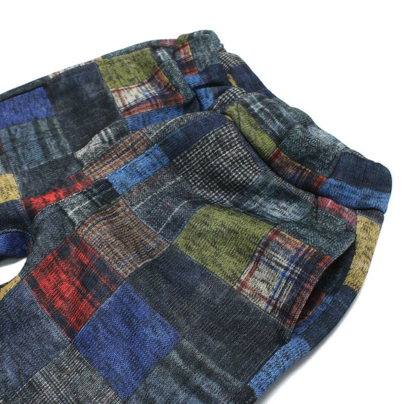 ・チェックパッチワーク風のプリントデザインが目を惹くパンツ