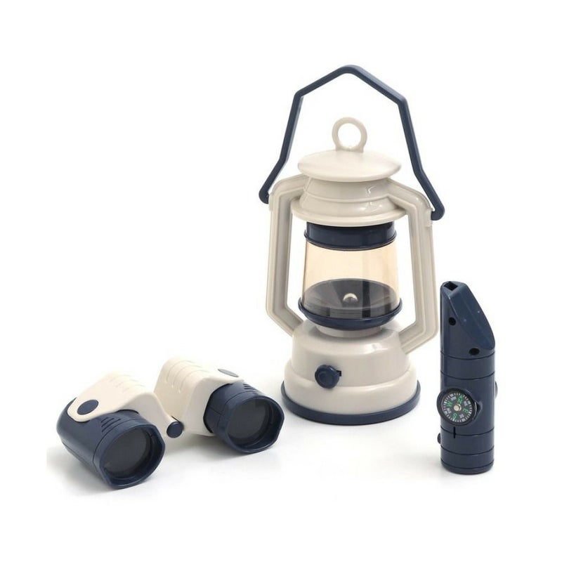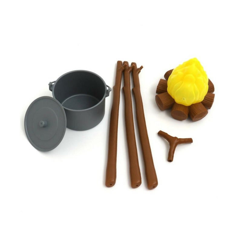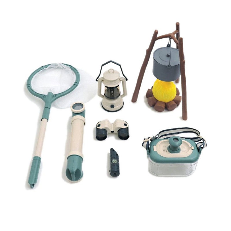 ・折り畳みテント、虫取り網、方位磁石付き笛、双眼鏡、ランタン、スコープ、レンズ付き虫かご、蓋つき鍋、焚火、木×3本、木の結合パーツが全てセットに