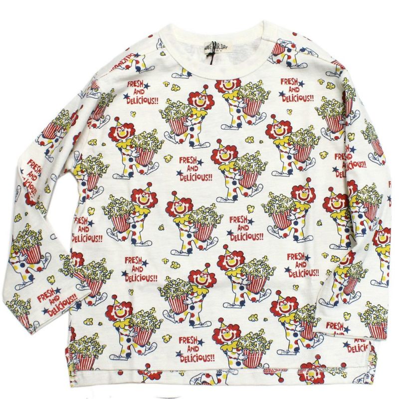 ・ピエロとポップコーンをプリントした総柄のロンT