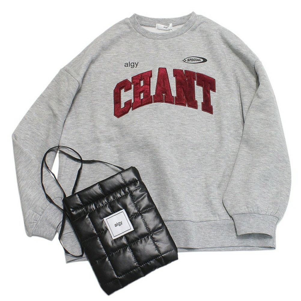 ・カレッジトレーナー風のロゴは光沢のあるベロアアップリケ