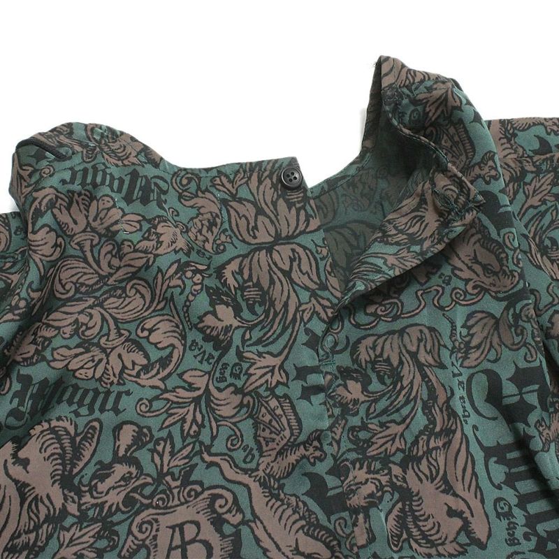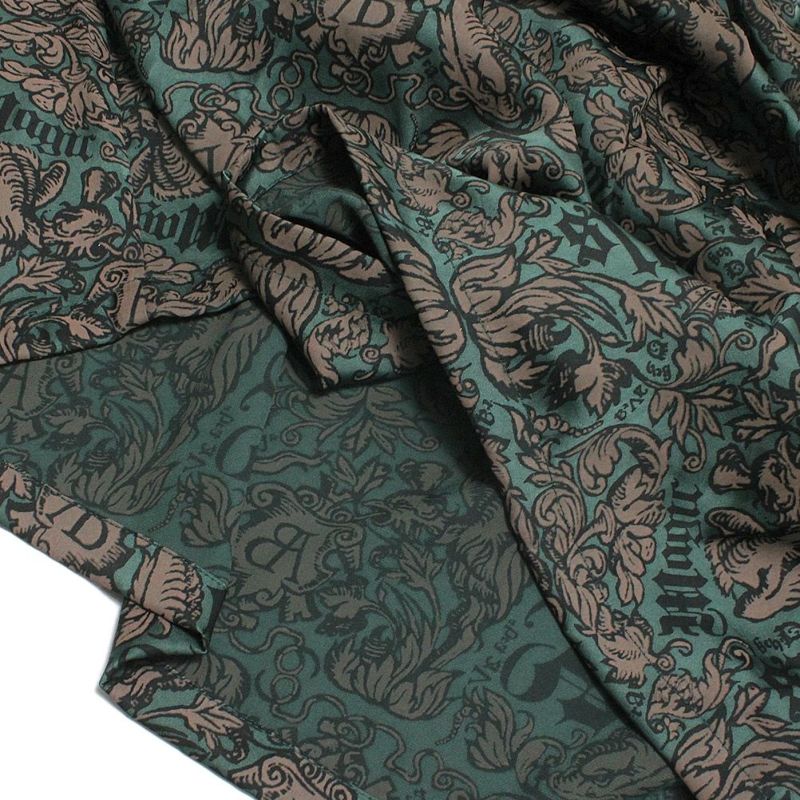 ・魔女の呪文や植物、ドラゴン、ハゲタカなどの中世のイラストを散りばめた図案を、しっとりしたとろみと艶感のあるヴィンテージサテンにプリントしたオリジナルテキスタイル