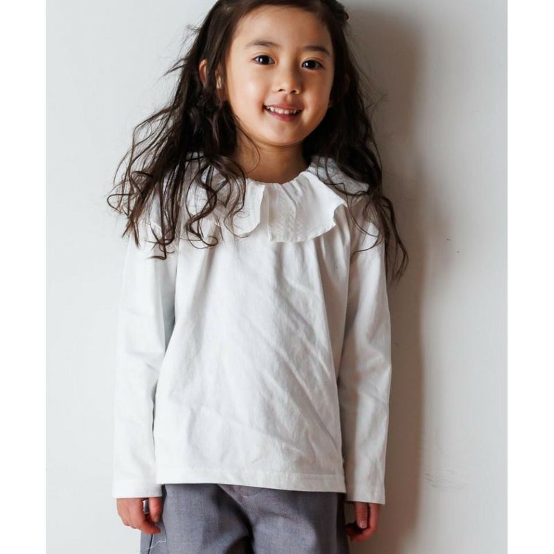 ・素材を切り替えたフリルが上品な長袖Tシャツ