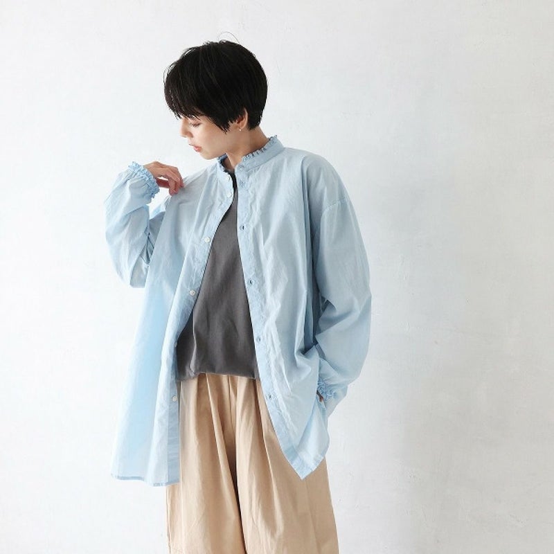・襟元と袖口にフリルをあしらったスタンドカラーシャツ