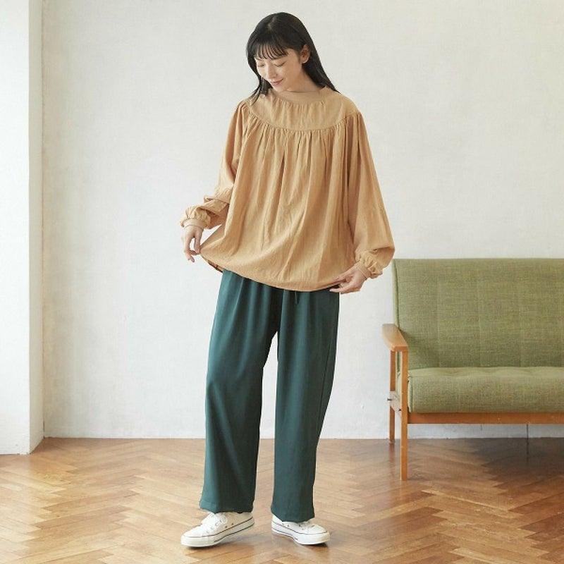 ・ギャザーで切り替えたデザインのプルオーバーブラウス