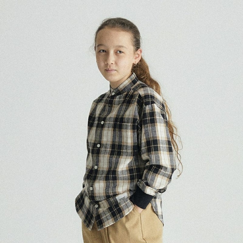 MODEL:134cm / チェックブラウン 26kg / L(130-140)サイズ着用