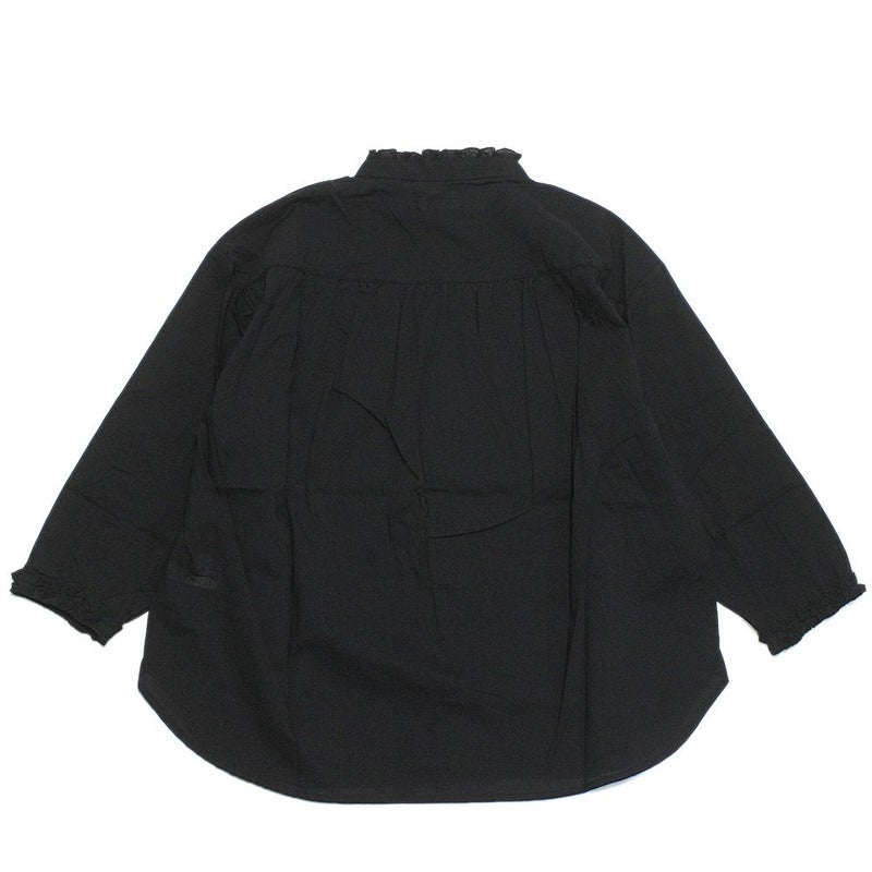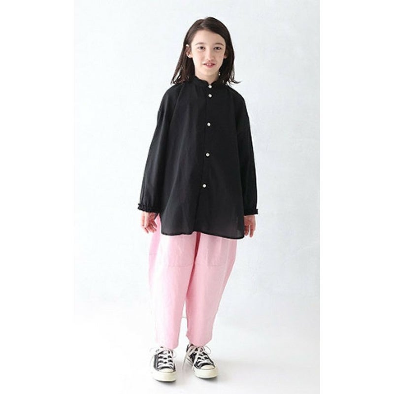 ・襟元と袖口にフリルをあしらったスタンドカラーシャツ