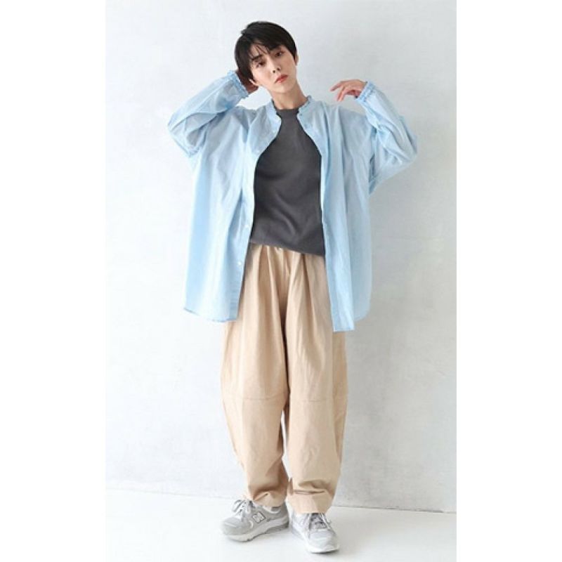 ・襟元と袖口にフリルをあしらったスタンドカラーシャツ