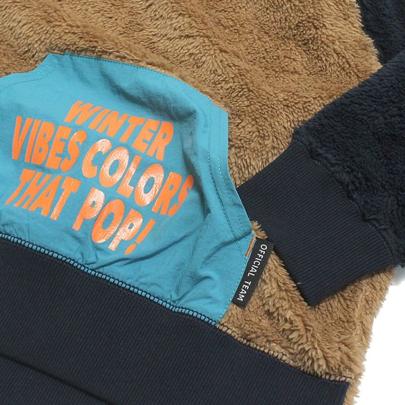・柔らかなボアにシャカシャカの異素材ポケットが付き