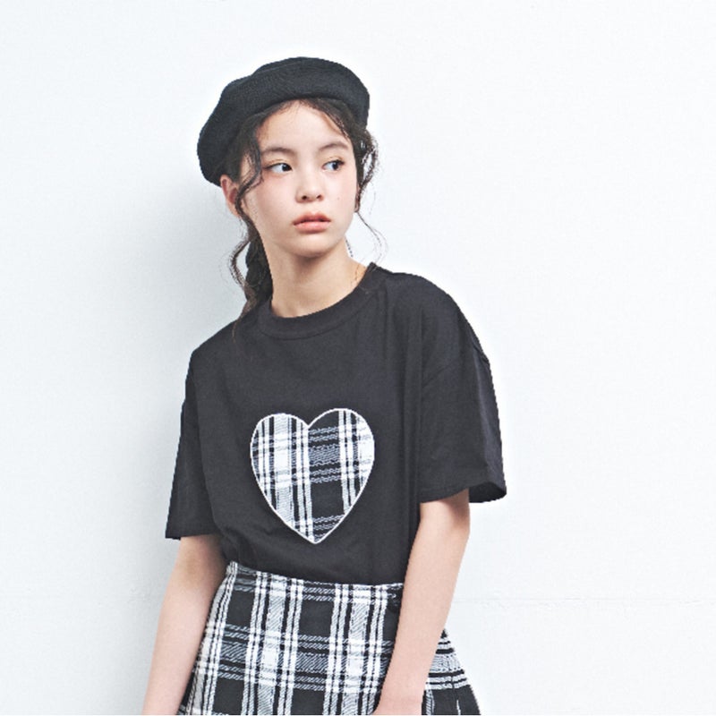 4. [マルーク] 天竺モノトーンチェックハートパッチTシャツ クロ(4)