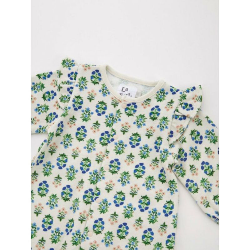 ・肩先にあしらったフリルと、袖口、足口に入ったギャザーが女の子らしいシルエット